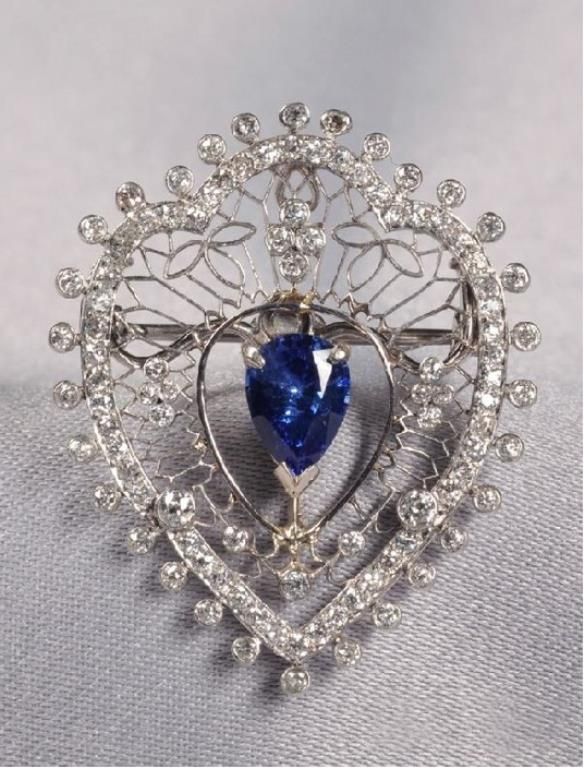 EDWARDIAN PLATINUM AND DIAMOND PENDANT BROOCH MARCUS & CO he finely pierced mount set with old mine-cut diamond melee, centering a later pear-shape sapphire, lg. 1 1/4 in., signed.