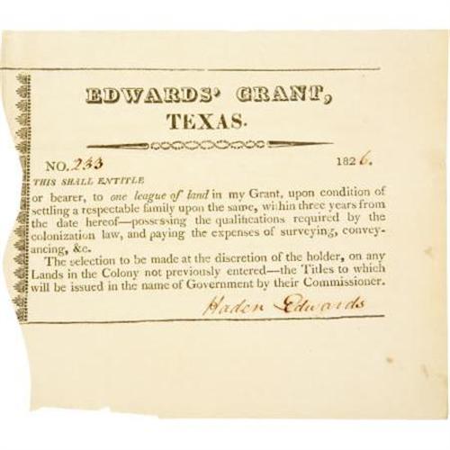 <B>[Edwards Grant] Partly Printed Document Signed by Haden Edwards.</B></I> Printed document completed in manuscript and signed by Haden Edwards. N.p., [dated in manuscript 1826]. One page, 16mo. Certificate number 233.<BR><BR>Edwards was a pioneer settler and land speculator. In 1823 he traveled to Mexico City, joining Stephen F. Austin, Robert Leftwich, and others in a three-year attempt to persuade the Mexican government to authorize American settlement in Texas. Their efforts resulted in the colonization law of 1824 in Mexico City and of 1825 in Saltillo, which allowed <I>empresarios</B></I> to introduce settlers to Texas. <BR><BR>Edwards received a grant near Nacogdoches where he could locate 800 families. Like other <I>empresarios</B></I> he agreed to honor preexisting grants and claims made by Spanish or Mexican officials, and of all the <I>empresarios</B></I>, Edwards probably had the most such claims, some over a century old. In 1825 he posted notices to inform all potential claimants that they must come forward with proof of their claims or he would consider the land his, subject to sale to new settlers. This angered the older settlers, who opposed Edwards. He was driven out two years later, fleeing to Louisiana for safety<BR><BR>This is apparently an unknown imprint relating to Texas, and is not noted by Streeter and without further research it is difficult to ascertain where this grant form was printed. In his introduction, Streeter makes the comment "We know of no printing in Texas between July, 1823, and September, 1829." It seems unlikely that Edwards would have had the form printed in Mexico. Following the biographical chronology in Bancroft's <I>Northern Mexico and Texas</B></I>, it appears that Edwards was back in the United States during the summer of 1826, and probably had these forms printed during that trip (Leftwich was back in the States in same time and had his colonization form printed in Nashville). Housed in a brown half-calf folder with marbled boards and gilt imprints on the spine. Uneven left edge slightly affects decorative border, but is otherwise in very fine condition. Fresh and clean, and quite rare. <I>From the collection of Darrel Brown.</B></I><BR><BR><I>Ex. Edwards family papers. From the collection of J. P. Bryan.</B></I><BR><BR><b>Shipping:</b> Books & Catalogs (<a target="_blank" href="http://www.heritageauctions.com/common/shipping.php">view shipping information</a>)