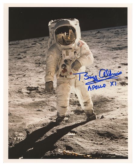 (b. 1930) American astronaut and pilot of the Apollo 11 lunar module who walked the Moon with Neil Armstrong. A group of three S.P.'s each in 8" x 10" format, includes: BUZZ ALDRIN, a great shot showing him walking on the moon, boldly signed in blue marker adding "Apollo XI". Along with EUGENE CERNAN, shows him on the lunar surface standing next to the American flag, boldly signed: "Gene Cernan Last Man on Moon Apollo XVII", and AL WORDEN, a formal shot of him in flight suit, boldly signed in blue marker: "Orbiting the Moon! Col. Al Worden Apollo 15 CMP". Three pieces, fine condition.