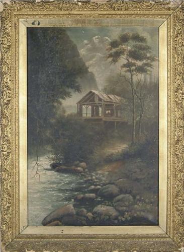 EDWIN LOCKE (American, 19th Century) THE MILL. Oil on canvas scene shows an open sided wood mill next to cascading water with mountains as backdrop. Signed lower left "E. Locke". Housed in its original gesso decorated wide frame. SIZE: 31-1/2" x 21". CONDITION: Original untouched condition, dirty. 9-27628
