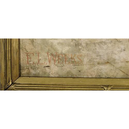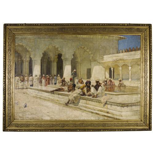 <B>EDWIN LORD WEEKS</B></I> (American 1849-1903)<BR><I>The Hour of Prayer At Muti-Mushid (Pearl Mosque), Agra,</B></I> circa 1888-89<BR>Oil on canvas<BR>79 x 118-1/2 inches (205.7 x 299.7 cm)<BR>Signed at lower left: <I>E L WEEKS</B></I><BR><BR>Provenance:<BR>Sale, American Art Association, New York, “Very Important Finished Pictures, Studies, Sketches and Original Drawings by the Late Edwin Lord Weeks to be sold at unrestricted public sale by order of his widow,” March 15-17, 1905, lot 189, to George D. Pratt;<BR>Mr. George D. Pratt, Brooklyn, New York, purchased for the collection of the Brooklyn Museum of Art in 1905;<BR>Brooklyn Museum, Brooklyn, New York, 1905-1947;<BR>Tobias Fisher and Company, New York in 1947;<BR>Private collection<BR><BR>Exhibition History:<BR>Paris, Salon of 1889 (medalist);<BR>London, Earl's Court, “Empire of India Exhibition,” 1895;<BR>“Romance of the Taj Mahal,” Los Angeles County Museum of Art, Los Angeles, California (December 17, 1979 through March 11, 1990); Toledo Museum of Art, Toledo, Ohio (April 28 through June 24, 1990); Virginia Museum of Fine Arts, Richmond, Virginia (August 23 through November 25, 1990);<BR>Asia Society, New York<BR><BR>Relevant Literature:<BR><I>Salon de 1889. Catalogue illustré,</B></I> Ludovic Baschet, ed., Paris, 1889, no. 2713, p. 44.<BR>A. Hustin, <I>Salon de 1892,</B></I> Paris, Ludovic Baschet, ed., Paris, 1892, p. 55 reproduces “Lord Edwin WEEKS” seated before <I>The Hour of Prayer at Muti-Mushid (Pearl Mosque), Agra</B></I> on the easel in his studio.<BR>Edwin Lord Weeks, <I>From the Black Sea through Persia and India,</B></I> London, Harper and Brothers, Co., 1895.<BR>University Art Galleries, University of New Hampshire, Durham, <I>The Art of Edwin Lord Weeks (1849-1903),</B></I> 1976.<BR>Pratapeditya Pal et al, <I>Romance of the Taj Mahal,</B></I> exh. cat. Los Angeles and New York, Thames and Hudson and the Los Angeles County Museum of Art, 1989, pp. 214-15.<BR>Lois Marie Fink, <I>American Art at the Nineteenth-Century Paris Salons,</B></I> Washington, D.C. and Cambridge, National Museum of American Art Smithsonian Institution and Cambridge University Press, 1990, p. 403.<BR>Ulrich W. Hiesinger, <I>Edwin Lord Weeks, Visions of India,</B></I> New York, Vance Jordan Fine Art, Inc., 2002.<BR><BR>Edwin Lord Weeks' 1888-89 masterpiece, <I>The Hour of Prayer at Muti-Mushid (Pearl Mosque), Agra,</B></I> is one of five monumental scenes of India which secured his reputation as America's most celebrated Orientalist painter of the late nineteenth century. Based upon the artist's second of three extended trips to India, in 1886-1887, <I>The Hour of Prayer at Muti-Mushid (Pearl Mosque), Agra</B></I> won a medal at the 1889 Paris Salon where it was displayed to enviable advantage. Six years later, Weeks chose this expansive sun-drenched view of the inner courtyard of the Pearl Mosque to represent him in the colossal “Empire of India” exhibition in London in 1895, where his achievement as the premier painter of Indian scenes was lavishly acknowledged with a medal of distinction, a monetary prize, and a special display of 78 of his works. From the time it was sold by the artist's widow in 1905, the Salon-scale <I>Hour of Prayer at Muti-Mushid</B></I> has had only two owners-the Brooklyn Museum of Art (1905-1947), which deaccessioned it at a time when academic painting had fallen sharply out of fashion, and a private American collection (1947-present). As such, it is in a fine state of preservation: it is unlined and in its original nineteenth-century frame that includes ornamental motifs complementing those depicted in the painting and reflecting the work of the noted American enthusiast of Indian design and Tiffany partner, Lockwood de Forest II (1850 - 1932), whose studio Weeks visited in Ahmedabad, India. Although not well-acquainted when they first met in India, Weeks and de Forest were distantly related (De Forest's mother was Julia Weeks de Forest).<BR><BR>Of all the Western “Orientalist” painters of his day, Edwin Lord Weeks produced the largest as well as the most compelling pictorial album of India. Unlike many of his contemporaries who explored Northern Africa and the Near East in their paintings, Weeks visited all the places he chose to portray and immersed himself in their cultures, particularly that of India which fascinated him above all others. In addition to the three visits he made to India in 1882-83, 1886-87, and 1892-93 at the height of his career (two accompanied by his wife), Weeks also journeyed to North Africa, Egypt, Syria, Palestine, Turkey, and Persia, where travel was often not only arduous but dangerous owing both to disease and to political upheaval. During his lifetime, Weeks was often described not simply as a “painter” but as a “painter-explorer” because his wanderlust compelled him to publish marvelous accounts of his travels fairly regularly in the major illustrated magazines (<I>Scribner's</B></I> and <I>Harper's New Monthly Magazine</B></I>). The artist's written descriptions of his travel experiences were as colorful as his paintings in their observation and detail. He also seems to have been something of a thrill-seeker by nature, and routinely went for extended climbs in the most treacherous parts of the Alps.<BR><BR>Even in terms of his outward appearance, the rather slight, bright-eyed and mustachioed New England “puritan” eventually came to resemble his subjects. As a mature artist, Weeks had acquired a sun-darkened complexion from his practice of sketching and painting outdoors in the streets, markets and bazaars beneath the relentless Indian midday sun. In choosing to settle in Paris, where his Salon-style academicism was more enthusiastically received than it had been in the United States, Weeks set himself up as a soft-spoken, but flamboyantly dressed ex-patriot in a studio first at 128 Avenue de Wagram, and later on the rue de Léonard da Vinci. H