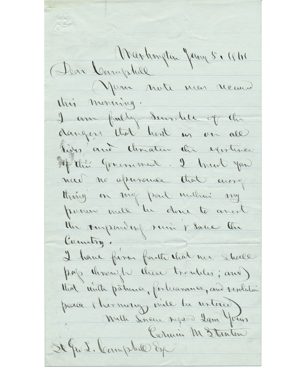 (1814 - 1869) Secretary of War in Abraham Lincoln's cabinet whose dismissal by Andrew Johnson led to impeachment hearings for the president. Fine content A.L.S. 1p. 8vo., Washington, Jan. 5, 1861. Just three months before the start of the Civil War, Stanton, then still Attorney General, writes to an ominous note to Lt. Gen. T. [?] Campbell, in full: "...Your note was received this morning. I am fully sensible of the dangers that beset us on all sides and threaten the the existence of this government. I trust you need no assurance that everything in my part within my power will be done to avert the impending ruin & save the country. I have firm faith that we shall pass through these troubles; and that with patience, forbearance; and resolution peace & harmony will be returned...". By January 1861 the Confederate States of America had been created and declared secessation. On January 4, Alabama troops seized an arsenal in Mobile, Alabama and, the day of this letter, Winfield S. Scott substituted a heavily-armed warship for a merchant vessel to sail to Ft. Sumter with supplies. The following day brought Florida's militia siege of a federal arsenal near Appalachiacola -- with five more states seceding before the month's end. Boldly penned and in very good condition.