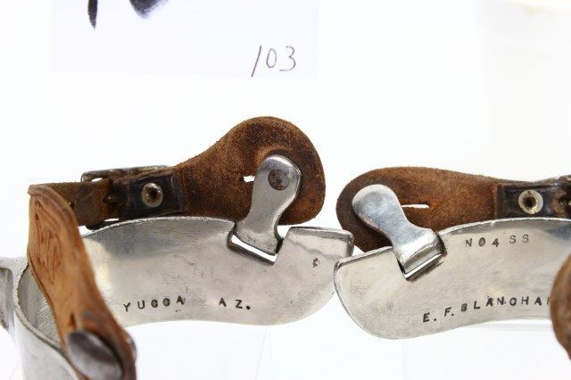 bands, 2 1/4" chap guard shanks and 1" rowels, stamped Yucca AZ. Includes unmarked leather straps with initials JM. Est. 700-1200