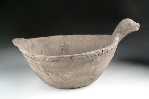 EFFIGY HEAD TYPE MISSISSIPPIAN BOWL. Mississippian period, Circa 1200-1500AD style. SIZE: 4-1/2in. h x 13in. dia. CONDITION: Several large stress cracks, fair to good. 9-25984-74 The Tennessee Collection of Prehistoric Indian Artifacts from the Allen Graves Estate. SPECIAL NOTE: We do not regularly sell Prehistoric Indian stone artifacts and therefore have very little experience and no expertise in this area. All of the following lots have come from the Collection of the Late Allen Graves of Tennessee. The collection was inherited some years back by his daughter, who now lives in Maine. This collection was consigned to us directly from her. We employed someone to generally identify styles and types, but as stated above, due to our lack of expertise in this field, we can not guarantee the age or origin of the following pieces. We are relying on you, the buyer, to determine to your satisfaction the origin and age of each item in the collection.