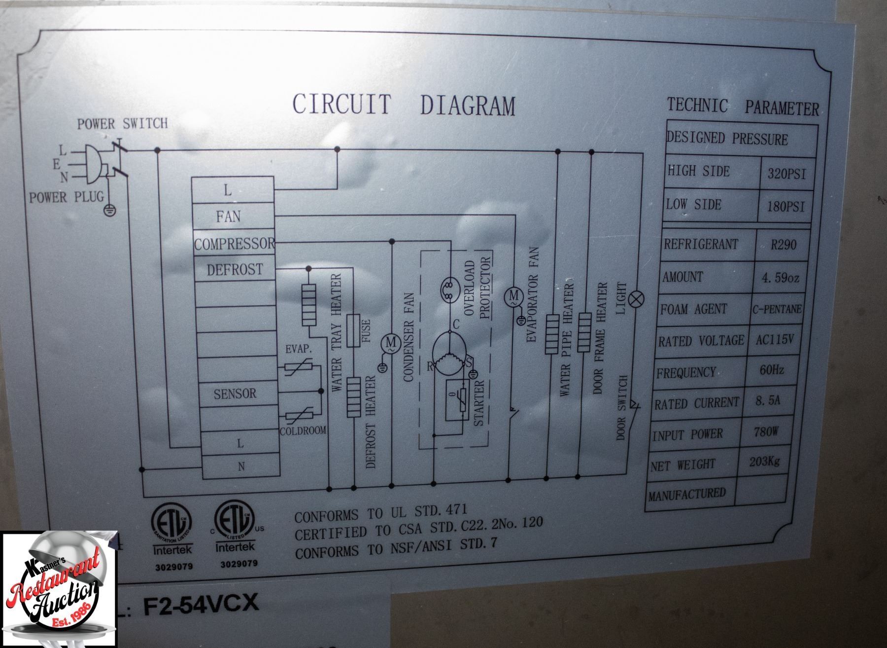 MODEL # F2-54VCX, AC 115 VOLTS, 60 HZ, 8.5 AMPS, 780 WATTS, REFRIGERANT R290, 203 KG, 54" X 32" X 82.5"