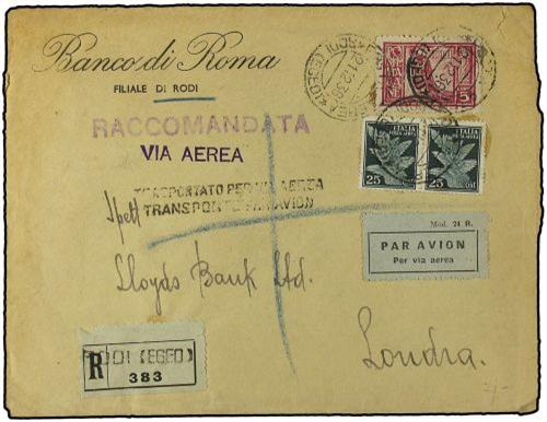 1936 Registered Air Mail envelope to London bearing Rhodes 25 c green (pair) (SG 20) and 5 l claret (SG 24) tied by POSTA AEREA RODI (EGEO) double ring with registered label sent Air Mail, routed via Brindisi and Milan with LONDON arrival. Very scarce franking of commercial mail bearing the 5 lire on cover.