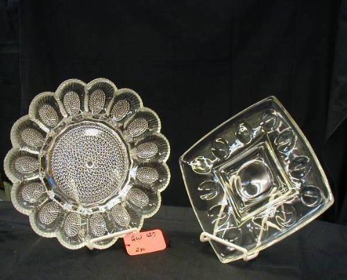 EGG PLATES (1) PRESSED DEVILED EGG 15 SECTION PLATE 11in, (1) SQ. DEVILED EGG PLATE 12 SECTIONS 9in, 2 PCS