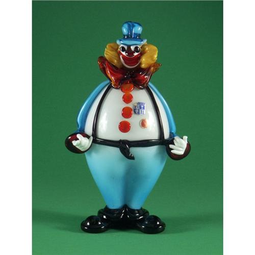 MURANO GLASS CLOWN: A large mouth-blown multicolored clown, 12.75'' H, egg shaped, large bow, white and blue colored body, with original label ''K and B Creations'', ''Made in Murano, Italy '', and a second round red label ''Made in Murano Italy'', 1960's.