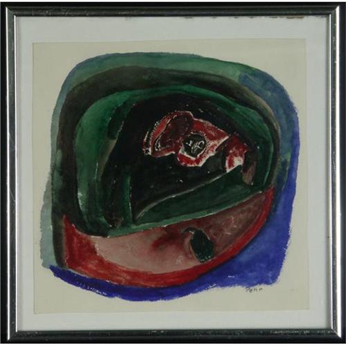 EGG TEMPERA ON PAPER, Pehr Hallsten (d. 1965), WA. Bird Encased in Circular Forms. Signed lower right. Inscription on the verso reads: ''Egg Tempera by Pehr, Mark Tobey's painter buddy, Europe''. Floating presentation in a silver metal frame. More info. at the front desk. 6.5'' x 6.75''/ 8.25'' x 8.25'' framed.