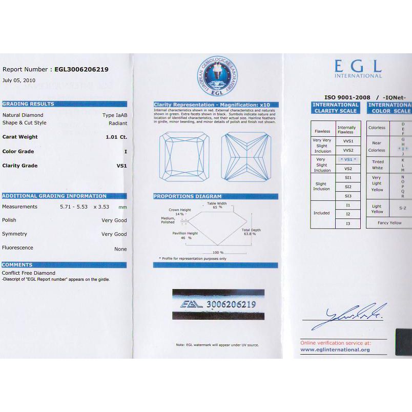EGL 1.01 ctw Certified Radiant Diamond I,VS1 **|**|** ; MSRP: $4400