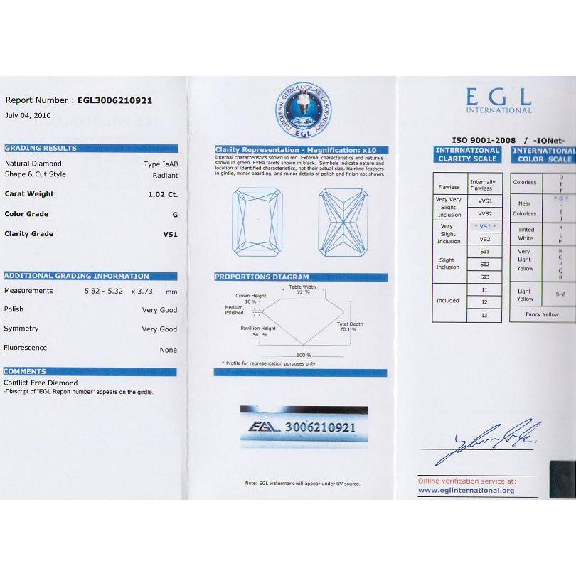 EGL 1.02 ctw Certified Radiant Diamond G,VS1 **|**|** ; MSRP: $6300