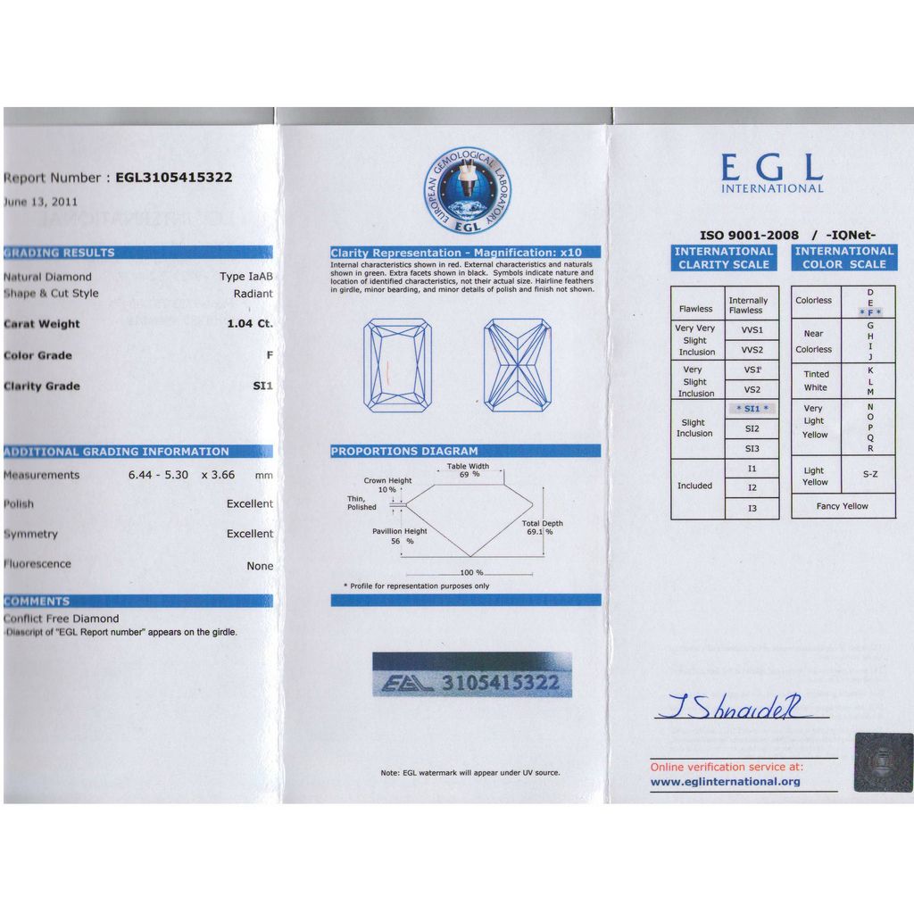 EGL 1.04 ctw Certified Radiant Diamond F,SI1 **|**|** ; MSRP: $5600