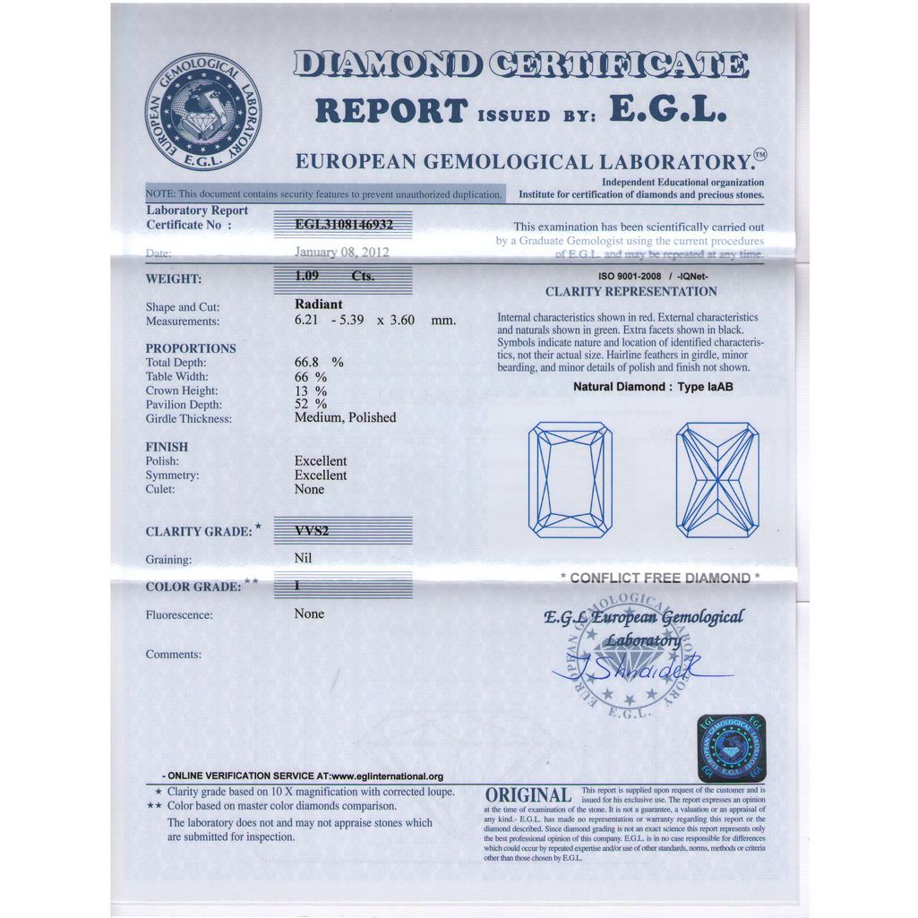 EGL 1.09 ctw Certified Radiant Diamond I,VVS2 **|**|** ; MSRP: $5900
