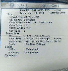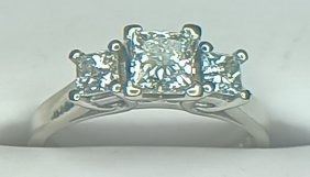 EGL Certified Natural Diamond. Center Diamond 0.80 ct. Color:(F) Clarity: VS-1 With (2) 0.30 ct. Natural Princess cut Diamonds Color:(F) Clarity: VS-1. Total combined carat weight 1.40 carats. Set in solid 14k White Gold 5.59 Grams. Size 6.5 standard. We will size prior to shipping upon request. Just email us. Any questions pleas ask. ***Low Reserve*** Happy Bidding. All lots are shipped FEDEX/UPS Insured with direct adult signature required.