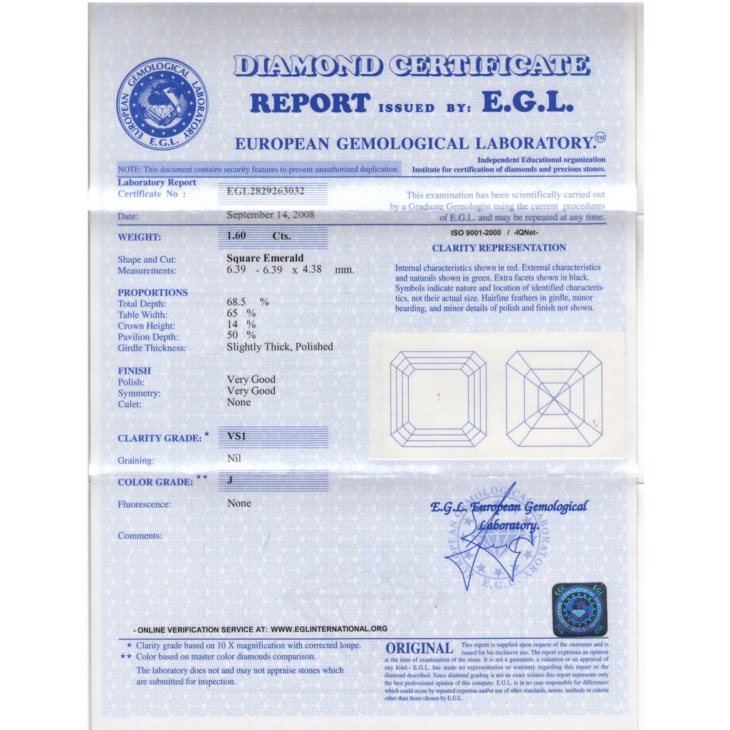 EGL 1.60 ctw Certified Asscher Brilliant Diamond, J, VS **|**|** ; MSRP: $8000