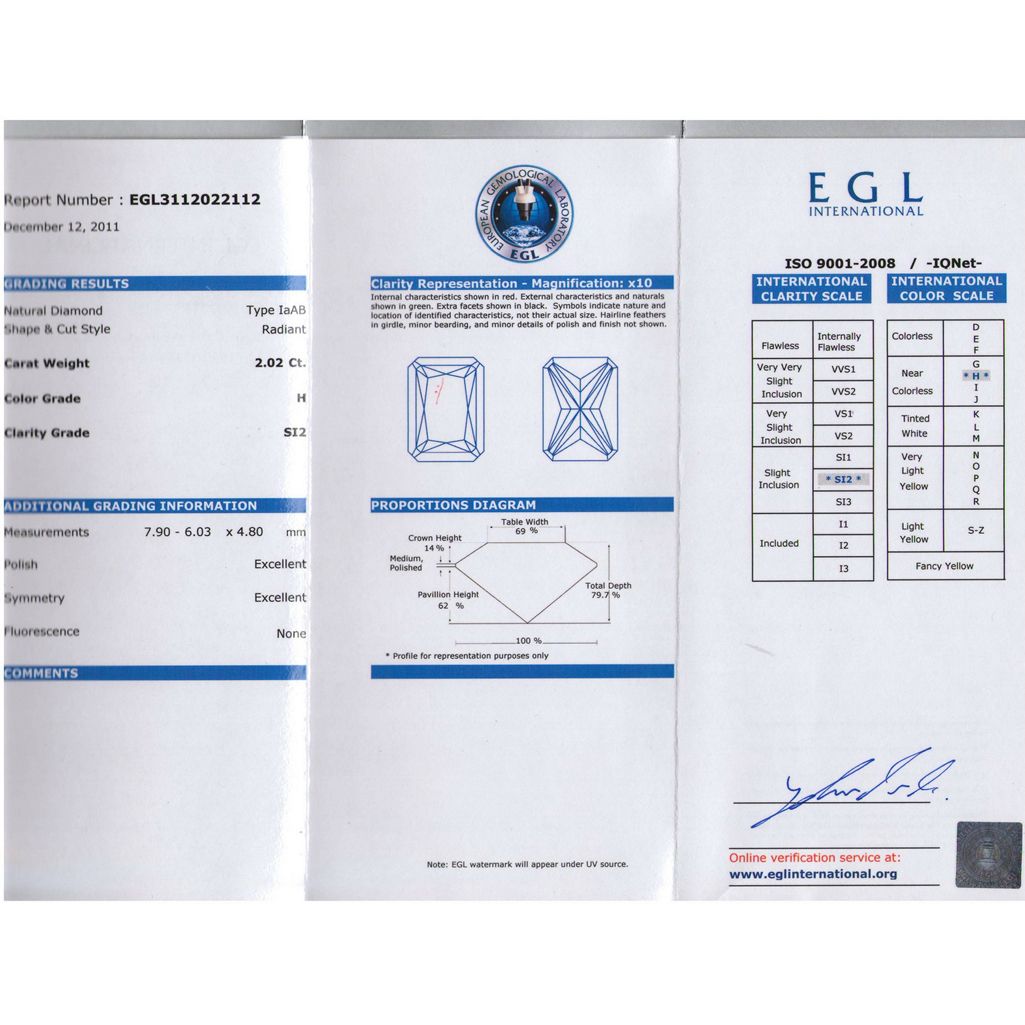 EGL 2.02 ctw Certified Radiant Diamond H,SI2 **|**|** ; MSRP: $13900