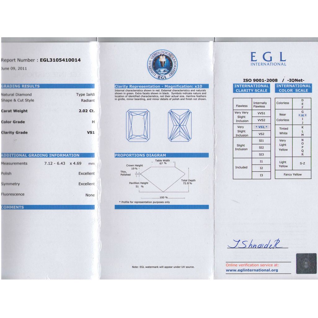 EGL 2.02 ctw Certified Radiant Diamond H,VS1 **|**|** ; MSRP: $21000