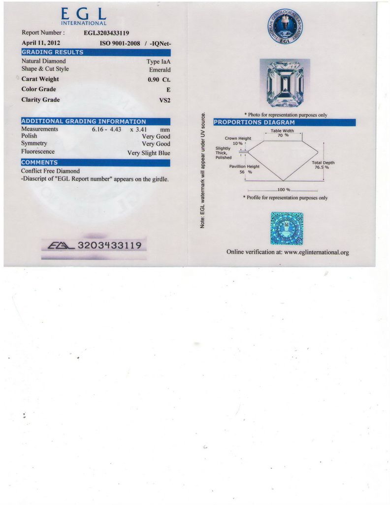 EGL CERTIFIED Emerald 0.90 Carat E,VS2 **|**|** Shape: Emerald ; CTW: 0.9 ; Color: E ; Clarity: VS2 ; Sym: VG ; Flour: VG ; Meas: 6.16x4.43x3.41 ; Certification: EGL ISRAEL ; Table: 76.5 ; Girth: 70 ; MSRP: $8800