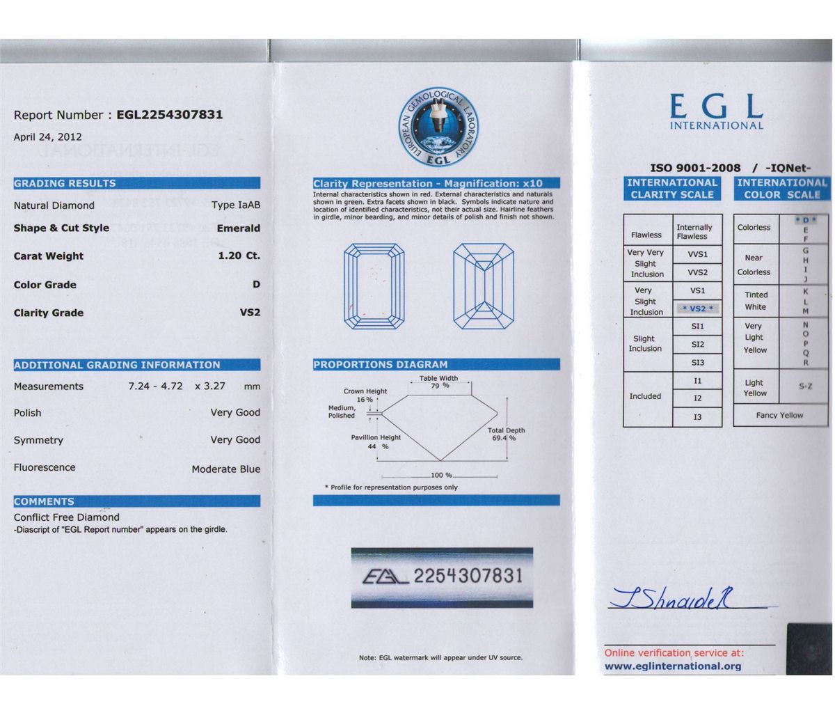EGL CERTIFIED Emerald 1.20 Carat D,VS2 **|**|** Shape: Emerald ; CTW: 1.2 ; Color: D ; Clarity: VS2 ; Sym: VG ; Flour: VG ; Meas: 7.24x4.72x3.27 ; Certification: EGL ISRAEL ; Table: 69.4 ; Girth: 79 ; MSRP: $18700