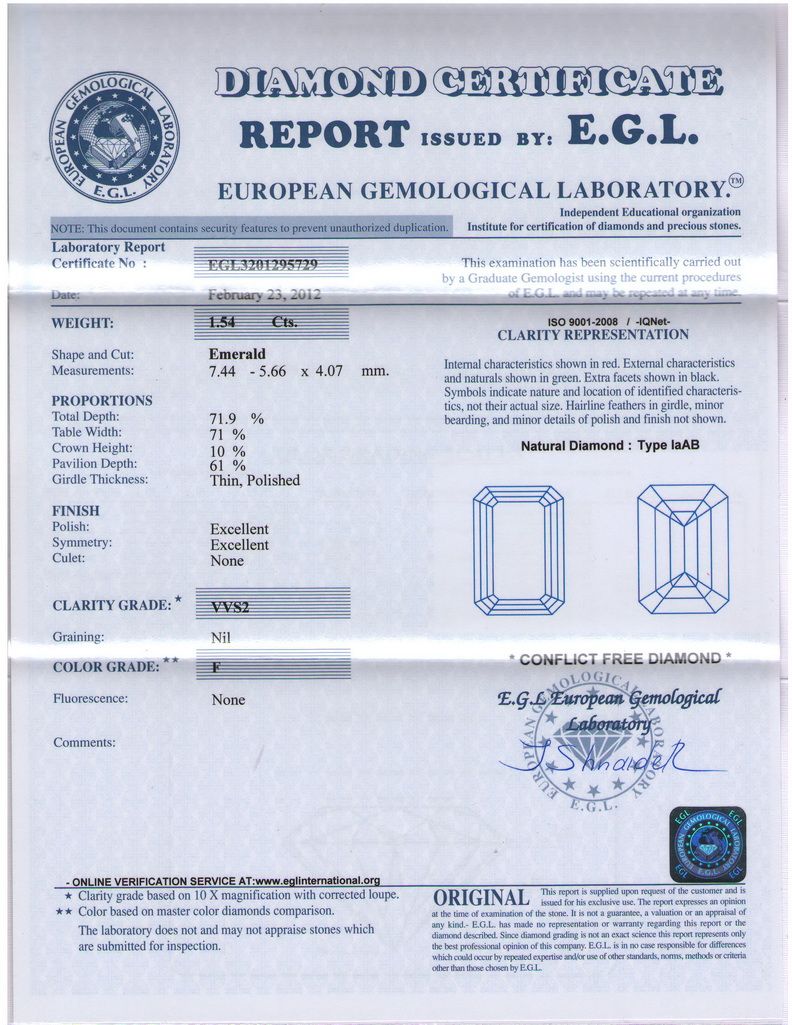 EGL CERTIFIED Emerald 1.54 Carat F,VVS2 **|**|** Shape: Emerald ; CTW: 1.54 ; Color: F ; Clarity: VVS2 ; Sym: EX ; Flour: EX ; Meas: 7.44x5.66x4.07 ; Certification: EGL ISRAEL ; Table: 71.9 ; Girth: 71 ; MSRP: $35200