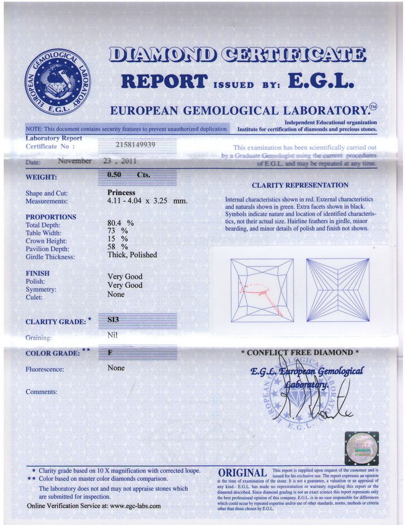 EGL CERTIFIED Princess 0.50 Carat F,SI3 **|**|** Shape: Princess ; CTW: 0.5 ; Color: F ; Clarity: SI3 ; Sym: VG ; Flour: VG ; Meas: 4.11x4.04x3.25 ; Certification: EGL ISRAEL ; Table: 80.4 ; Girth: 73 ; Comment: EYECLEAN ; MSRP: $2000