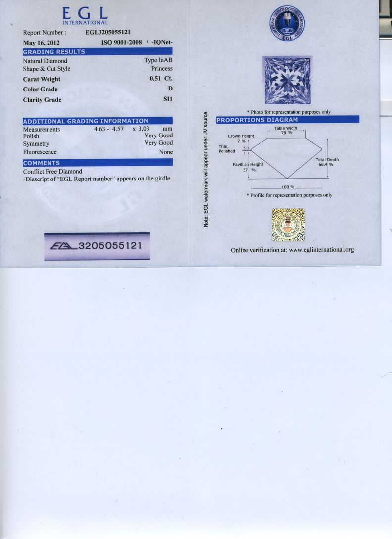 EGL CERTIFIED Princess 0.51 Carat D,SI1 **|**|** Shape: Princess ; CTW: 0.51 ; Color: D ; Clarity: SI1 ; Sym: VG ; Flour: VG ; Meas: 4.63x4.57x3.03 ; Certification: EGL ISRAEL ; Table: 66.4 ; Girth: 79 ; MSRP: $2600
