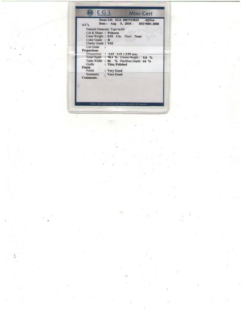 EGL CERTIFIED Princess 0.51 Carat D,VS1 **|**|** Shape: Princess ; CTW: 0.51 ; Color: D ; Clarity: VS1 ; Sym: VG ; Flour: VG ; Meas: 4.63x4.41x3.09 ; Certification: EGL ISRAEL ; Table: 70.1 ; Girth: 86 ; MSRP: $3900