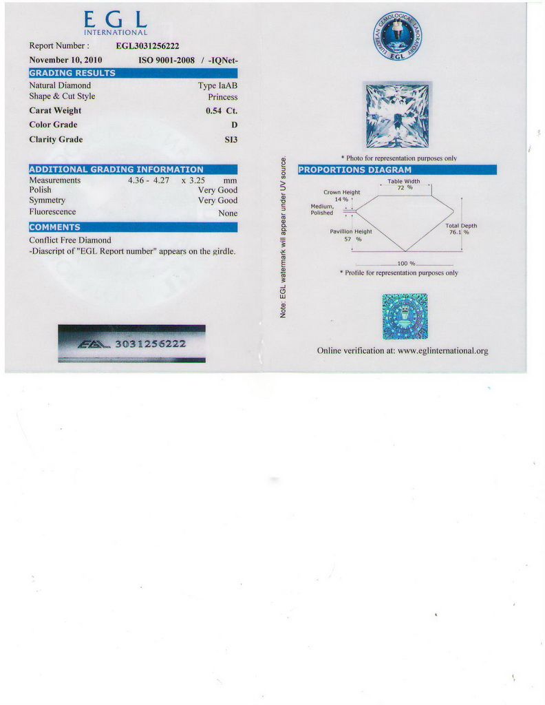EGL CERTIFIED Princess 0.54 Carat D,SI3 **|**|** Shape: Princess ; CTW: 0.54 ; Color: D ; Clarity: SI3 ; Sym: VG ; Flour: VG ; Meas: 4.36x4.27x3.25 ; Certification: EGL ISRAEL ; Table: 76.1 ; Girth: 72 ; Comment: EYECLEANISH ; MSRP: $2500