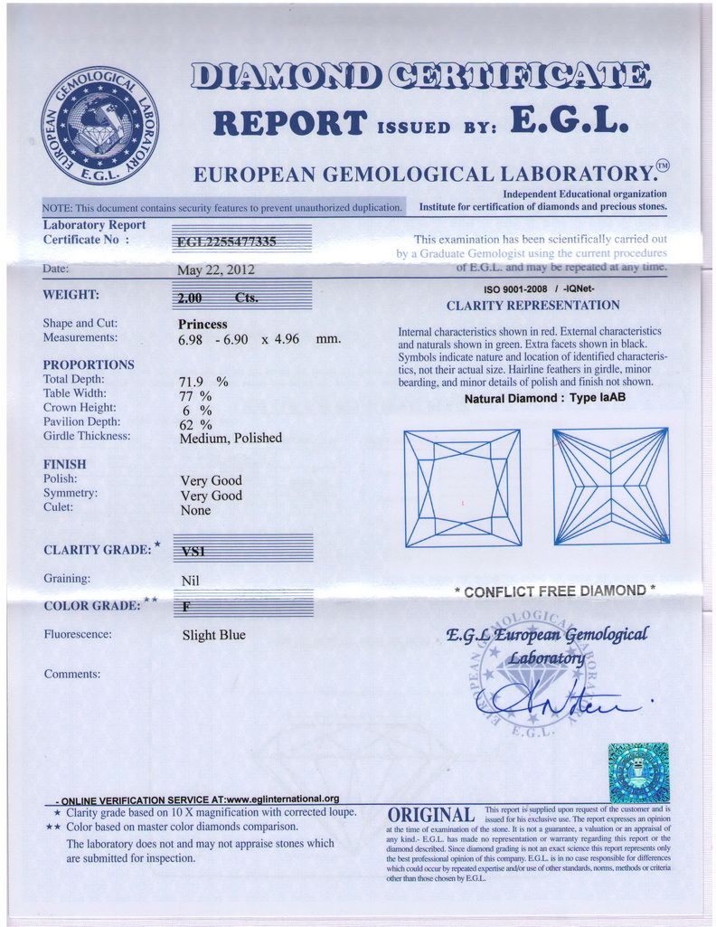 EGL CERTIFIED Princess 2.0 Carat F,VS1 **|**|** Shape: Princess ; CTW: 2 ; Color: F ; Clarity: VS1 ; Sym: VG ; Flour: VG ; Meas: 6.98x6.90x4.96 ; Certification: EGL ISRAEL ; Table: 71.9 ; Girth: 77 ; MSRP: $50200