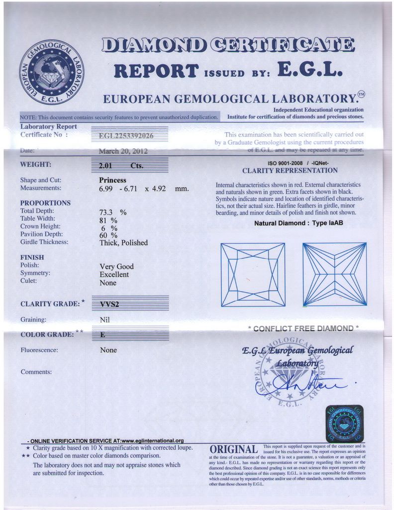 EGL CERTIFIED Princess 2.01 Carat E,VVS2 **|**|** Shape: Princess ; CTW: 2.01 ; Color: E ; Clarity: VVS2 ; Sym: VG ; Flour: EX ; Meas: 6.99x6.71x4.92 ; Certification: EGL ISRAEL ; Table: 73.3 ; Girth: 81 ; MSRP: $65800