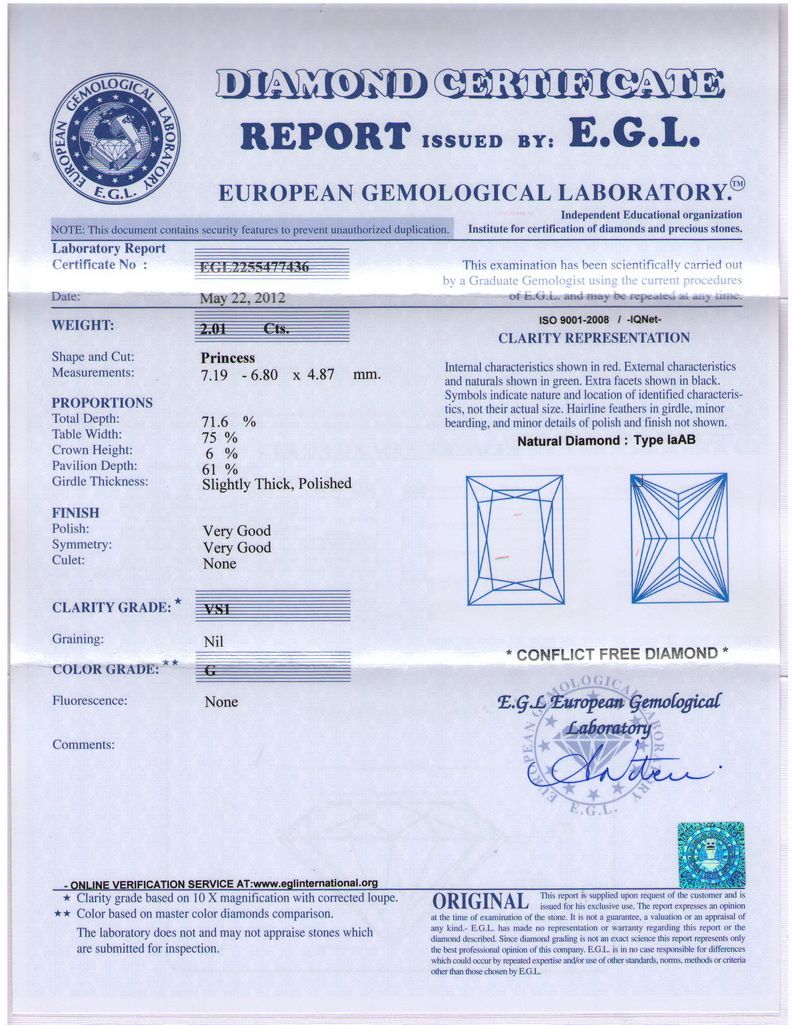 EGL CERTIFIED Princess 2.01 Carat G,VS1 **|**|** Shape: Princess ; CTW: 2.01 ; Color: G ; Clarity: VS1 ; Sym: VG ; Flour: VG ; Meas: 7.19x6.80x4.87 ; Certification: EGL ISRAEL ; Table: 71.6 ; Girth: 75 ; MSRP: $46800