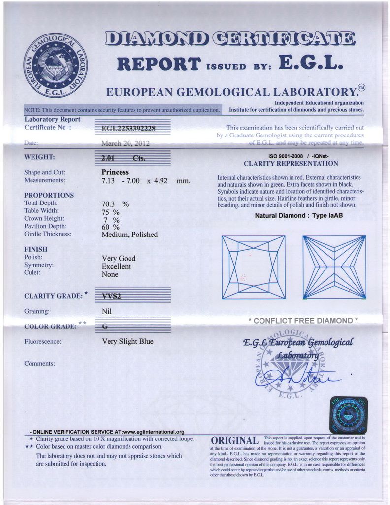 EGL CERTIFIED Princess 2.01 Carat G,VVS2 **|**|** Shape: Princess ; CTW: 2.01 ; Color: G ; Clarity: VVS2 ; Sym: VG ; Flour: EX ; Meas: 7.13x7.00x4.92 ; Certification: EGL ISRAEL ; Table: 70.3 ; Girth: 75 ; MSRP: $49400