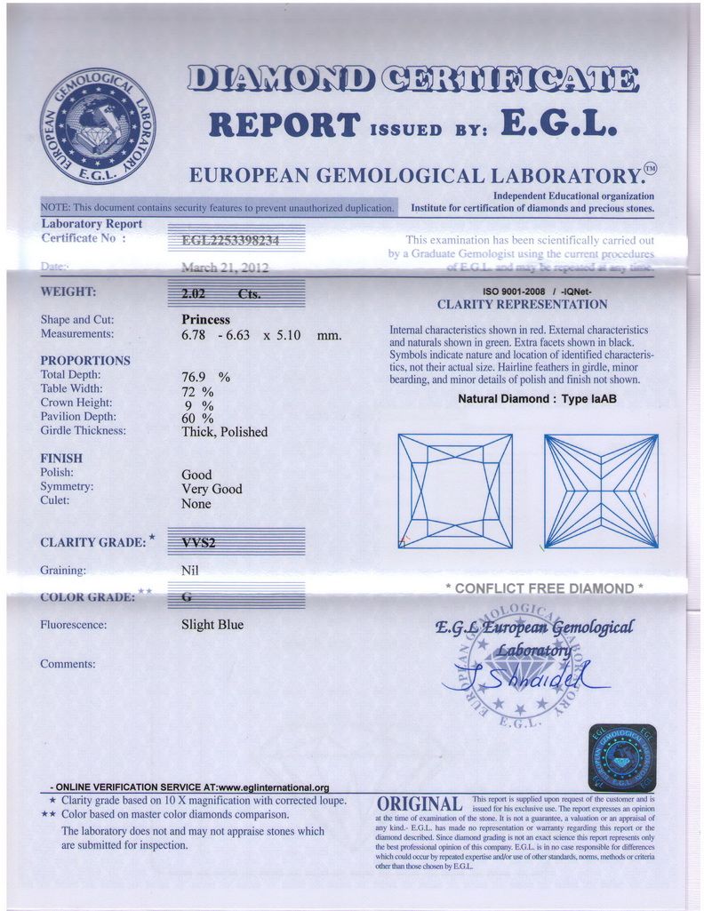 EGL CERTIFIED Princess 2.02 Carat G,VVS2 **|**|** Shape: Princess ; CTW: 2.02 ; Color: G ; Clarity: VVS2 ; Sym: G ; Flour: VG ; Meas: 6.78x6.63x5.10 ; Certification: EGL ISRAEL ; Table: 76.9 ; Girth: 72 ; MSRP: $49600