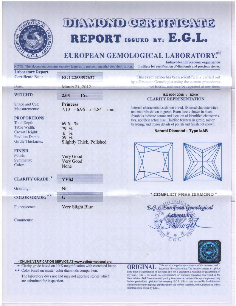 EGL CERTIFIED Princess 2.03 Carat G,VVS2 **|**|** Shape: Princess ; CTW: 2.03 ; Color: G ; Clarity: VVS2 ; Sym: VG ; Flour: VG ; Meas: 7.10x6.96x4.84 ; Certification: EGL ISRAEL ; Table: 69.6 ; Girth: 79 ; MSRP: $49900