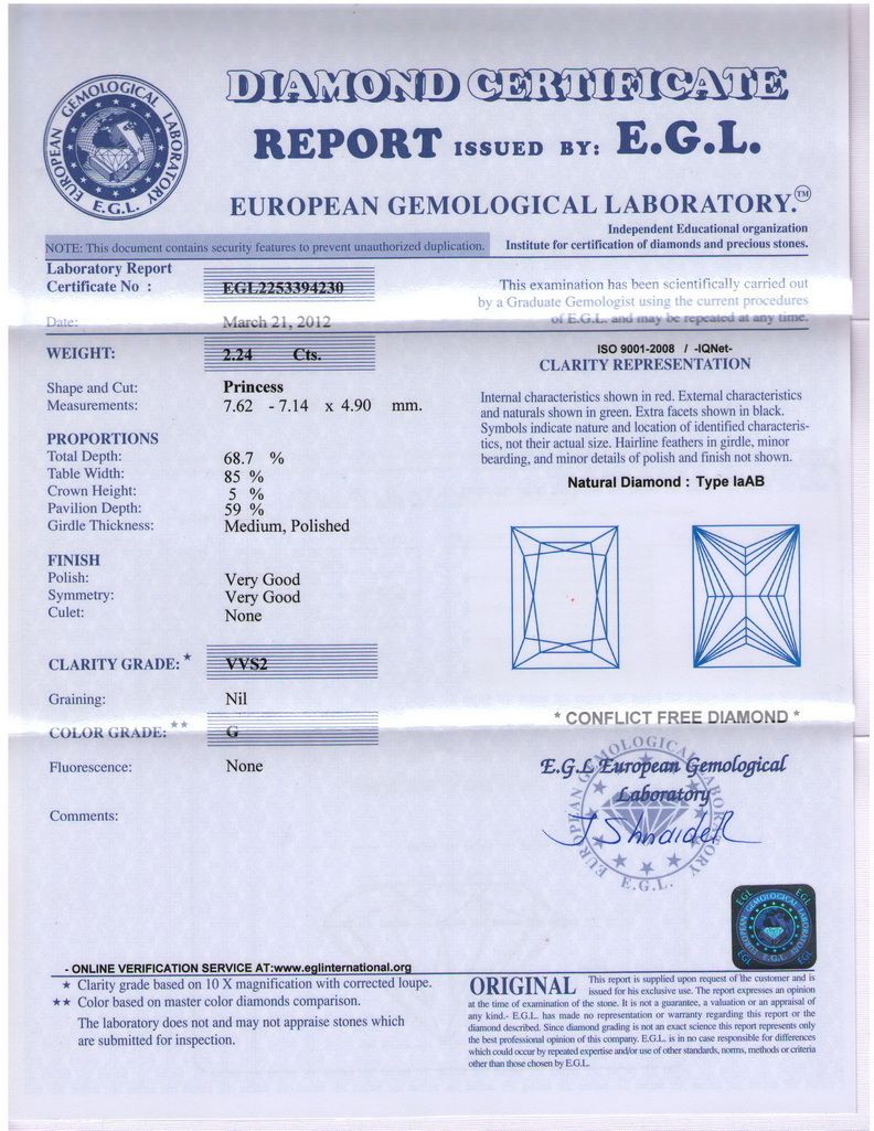 EGL CERTIFIED Princess 2.24 Carat G,VVS2 **|**|** Shape: Princess ; CTW: 2.24 ; Color: G ; Clarity: VVS2 ; Sym: VG ; Flour: VG ; Meas: 7.62x7.14x4.90 ; Certification: EGL ISRAEL ; Table: 68.7 ; Girth: 85 ; MSRP: $55000