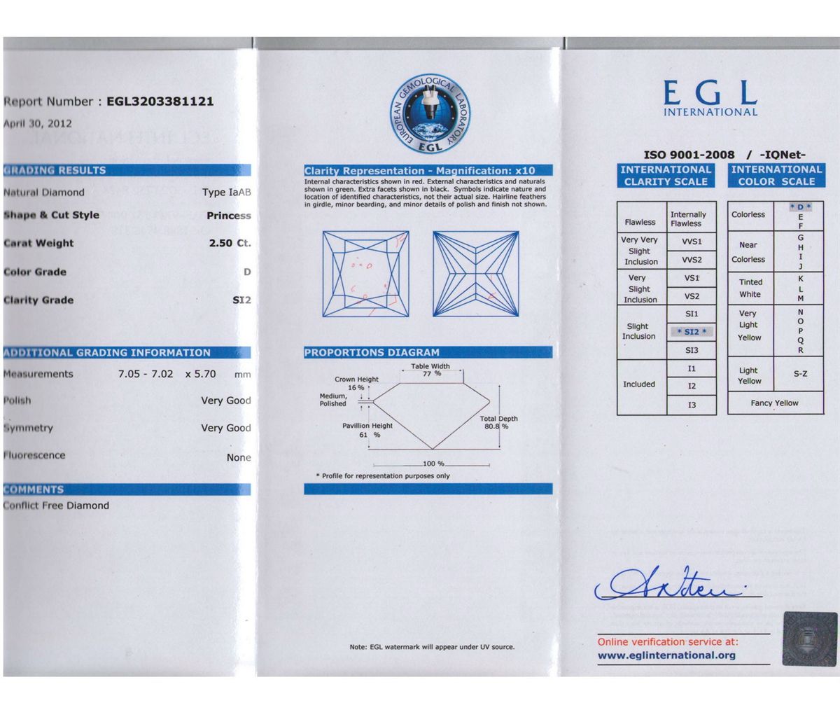 EGL CERTIFIED Princess 2.50 Carat D,SI2 **|**|** Shape: Princess ; CTW: 2.5 ; Color: D ; Clarity: SI2 ; Sym: VG ; Flour: VG ; Meas: 7.05x7.02x5.70 ; Certification: EGL ISRAEL ; Table: 80.8 ; Girth: 77 ; Comment: EYECLEANISH ; MSRP: $39100