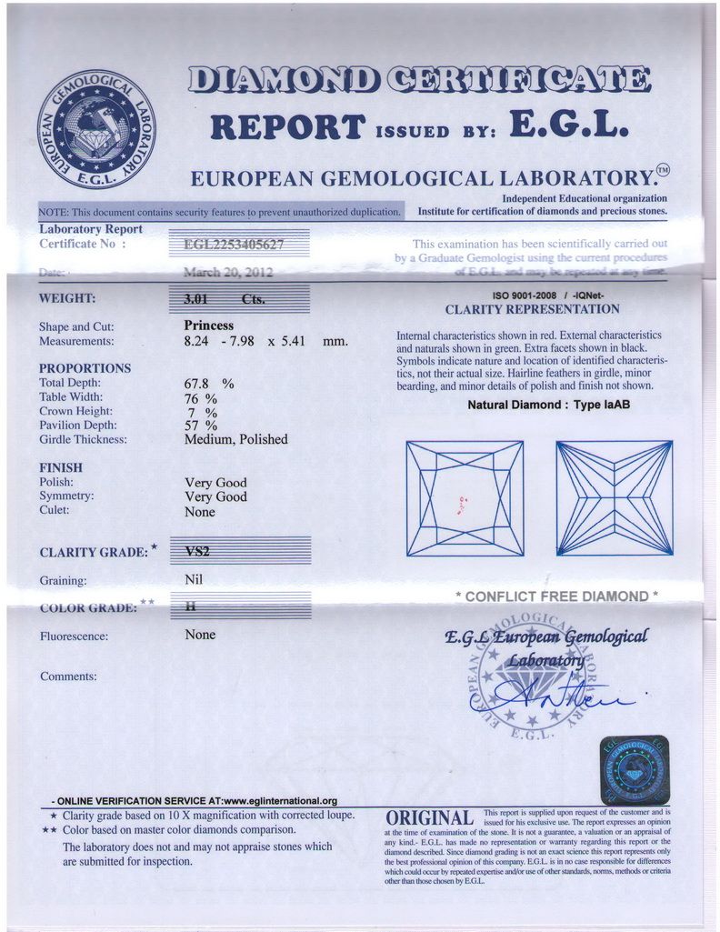 EGL CERTIFIED Princess 3.01 Carat H,VS2 **|**|** Shape: Princess ; CTW: 3.01 ; Color: H ; Clarity: VS2 ; Sym: VG ; Flour: VG ; Meas: 8.24x7.98x5.41 ; Certification: EGL ISRAEL ; Table: 67.8 ; Girth: 76 ; MSRP: $70100