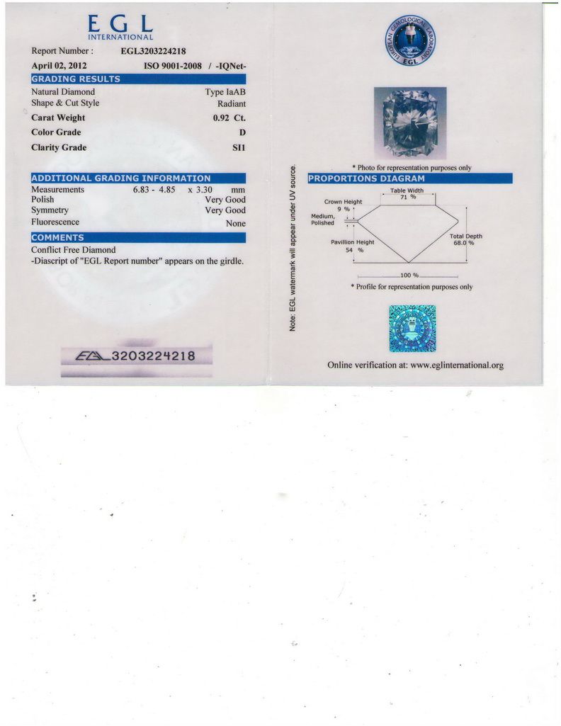 EGL CERTIFIED Radiant 0.92 Carat D,SI1 **|**|** Shape: Radiant ; CTW: 0.92 ; Color: D ; Clarity: SI1 ; Sym: VG ; Flour: VG ; Meas: 6.83x4.85x3.30 ; Certification: EGL ISRAEL ; Table: 68 ; Girth: 71 ; MSRP: $6700