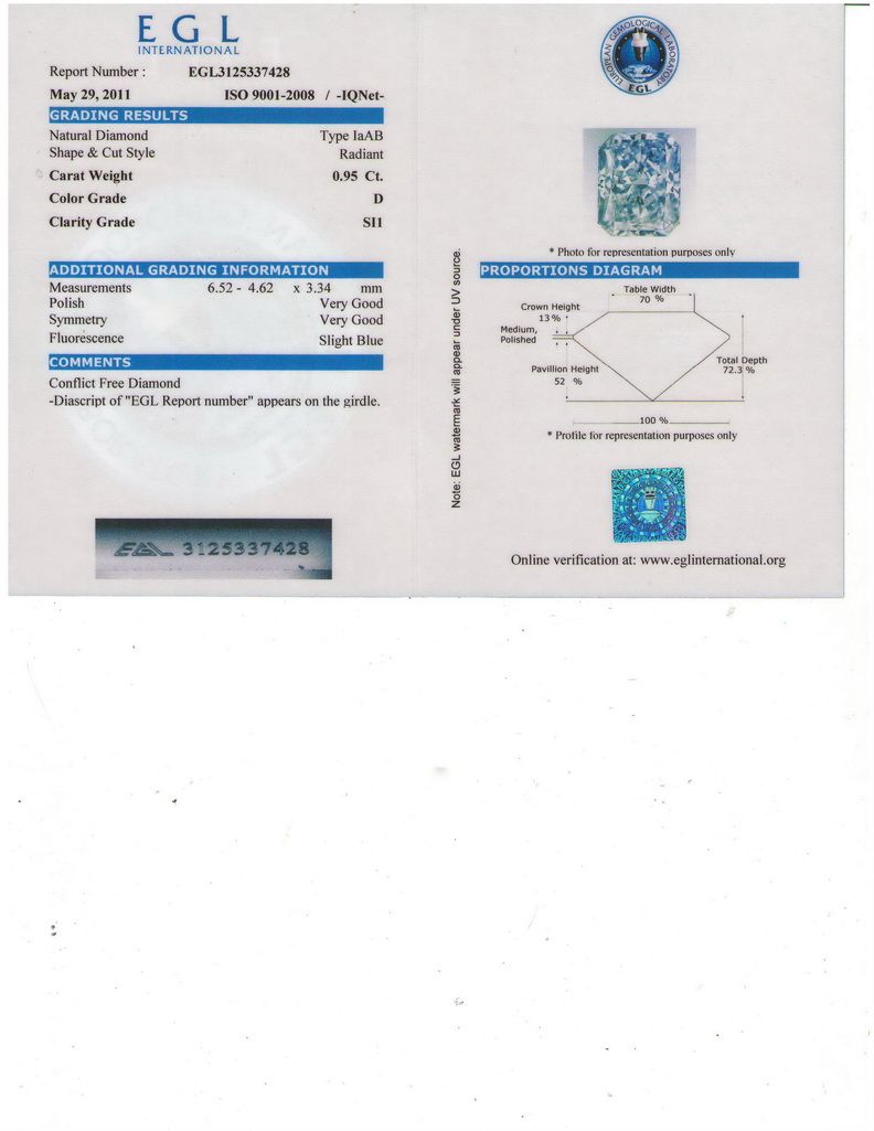 EGL CERTIFIED Radiant 0.95 Carat D,SI1 **|**|** Shape: Radiant ; CTW: 0.95 ; Color: D ; Clarity: SI1 ; Sym: VG ; Flour: VG ; Meas: 6.52x4.62x3.34 ; Certification: EGL ISRAEL ; Table: 72.3 ; Girth: 70 ; Comment: SUPER BUY ; MSRP: $5900
