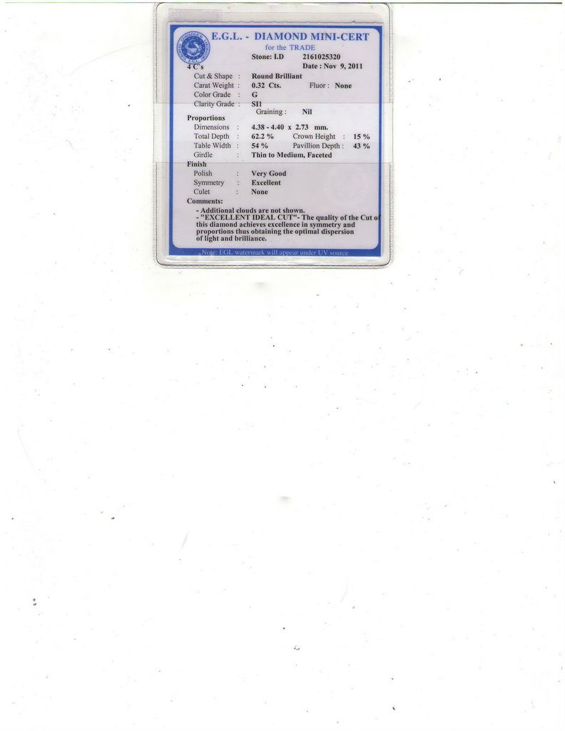EGL CERTIFIED Round 0.32 Carat G,SI1 **|**|** Shape: Round ; CTW: 0.32 ; Color: G ; Clarity: SI1 ; Sym: VG ; Flour: EX ; Meas: 4.38-4.40x2.73 ; Certification: EGL ISRAEL ; Depth: 62.2; Table: 54 ; Comment: EXCELLENT IDEAL CUT ; MSRP: $600