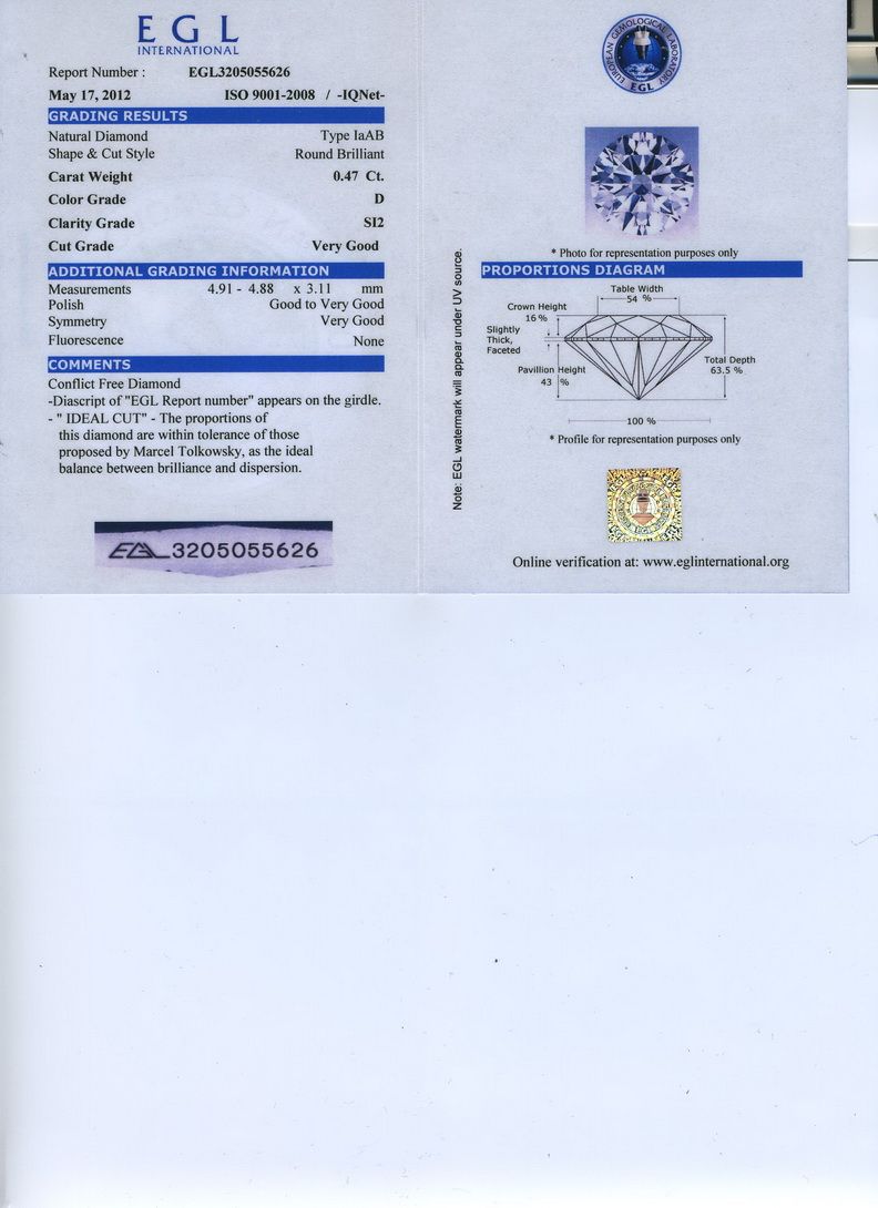 EGL CERTIFIED Round 0.47 Carat D,SI2 **|**|** Shape: Round ; CTW: 0.47 ; Color: D ; Clarity: SI2 ; Cut: Very Good ; Sym: VG ; Flour: VG ; Meas: 4.88-4.91x3.11 ; Certification: EGL ISRAEL ; Depth: 63.5; Table: 54 ; Comment: EYE CLEAN, IDEAL CUT+ H & A. ; MSRP: $800