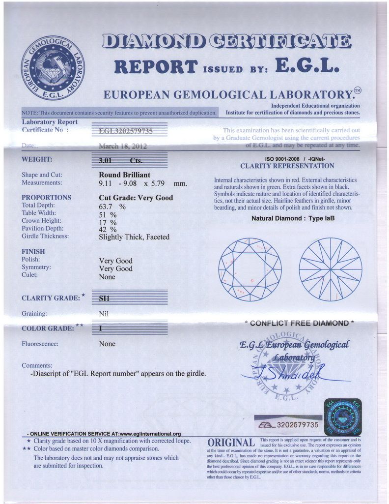 EGL CERTIFIED Round 3.01 Carat I,SI1 **|**|** Shape: Round ; CTW: 3.01 ; Color: I ; Clarity: SI1 ; Cut: Very Good ; Sym: VG ; Flour: VG ; Meas: 9.08-9.11x5.79 ; Certification: EGL ISRAEL ; Depth: 63.7; Table: 51 ; Comment: ; MSRP: $22000