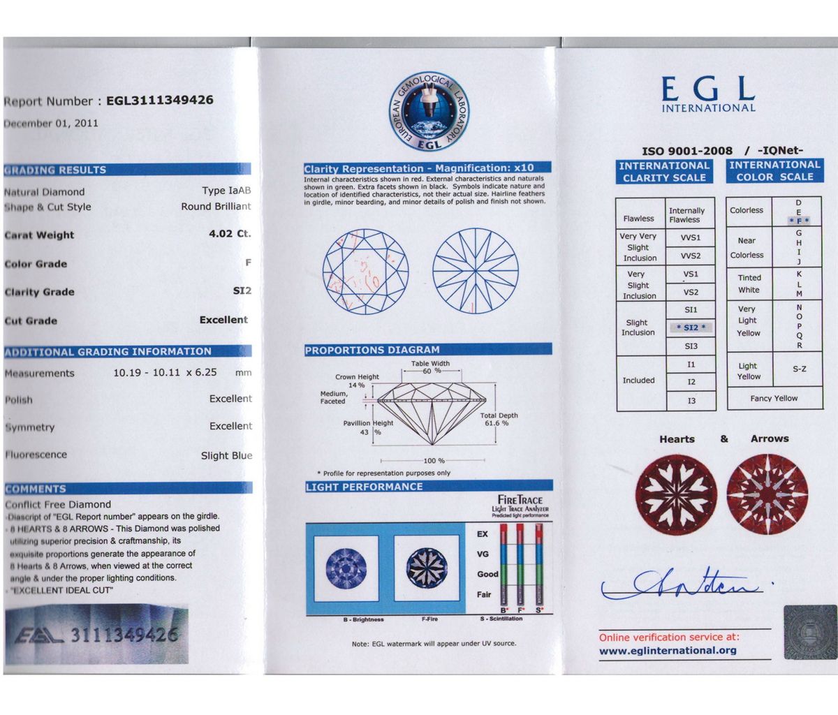 EGL CERTIFIED Round 4.02 Carat F,SI2 **|**|** Shape: Round ; CTW: 4.02 ; Color: F ; Clarity: SI2 ; Cut: Excellent ; Sym: EX ; Flour: EX ; Meas: 10.11-10.19x6.25 ; Certification: EGL ISRAEL ; Depth: 61.6; Table: 60 ; Comment: EYECLEANISH EXCELLENT IDEAL CUT ; MSRP: $42300