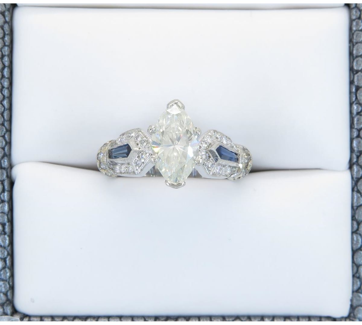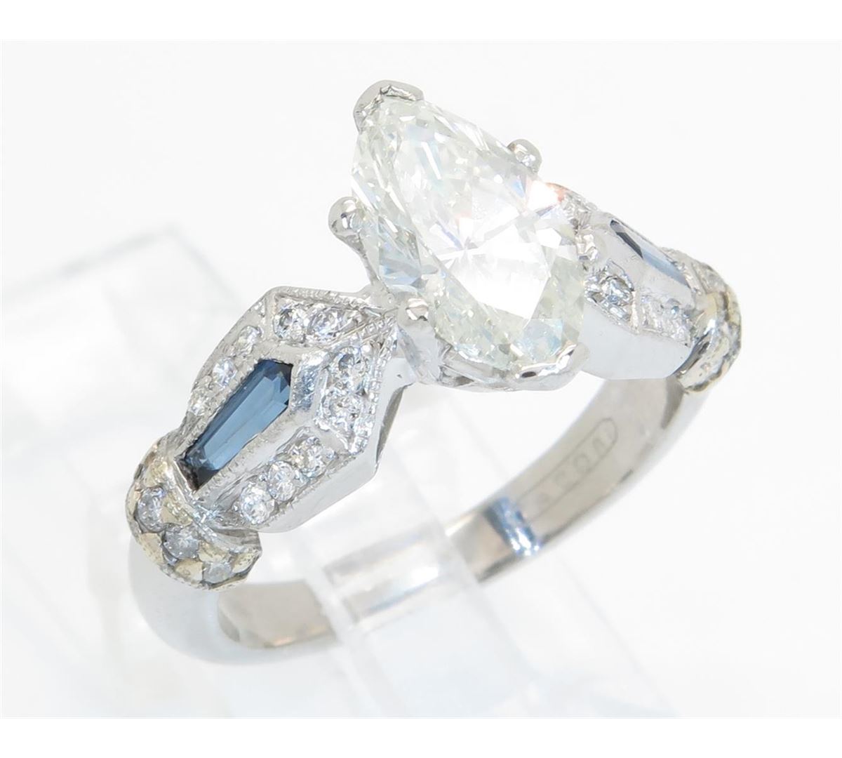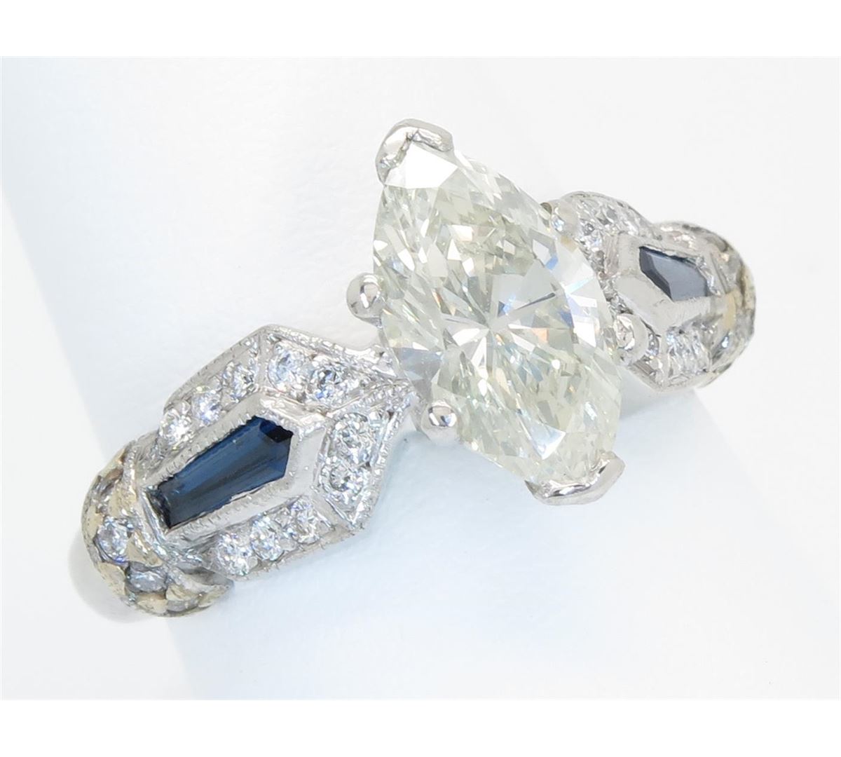 One tested platinum designer Tacori diamond ring. Containing: One EGL Certified Marquise Cut Diamond. Size: 1.74CT, Clarity: SI1, Color: J. 30 Round Brilliant Cut Diamonds, 2 blue sapphires. Approximate total diamond weight: 2.08CTW. Diamonds are graded in the mounting, unless otherwise stated. Weight: 9.1 grams. Size: 6.5 EGL USA Appraised.