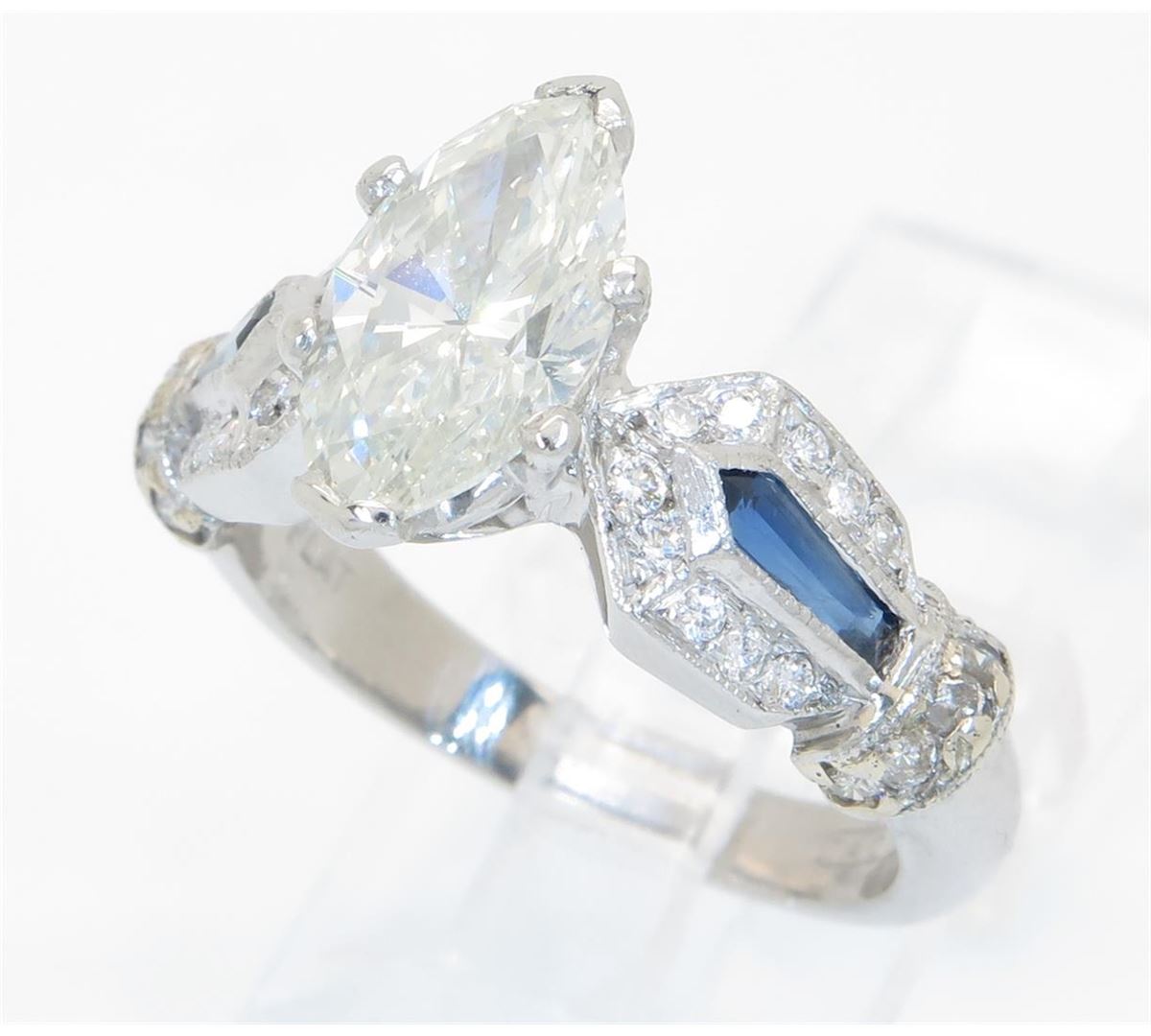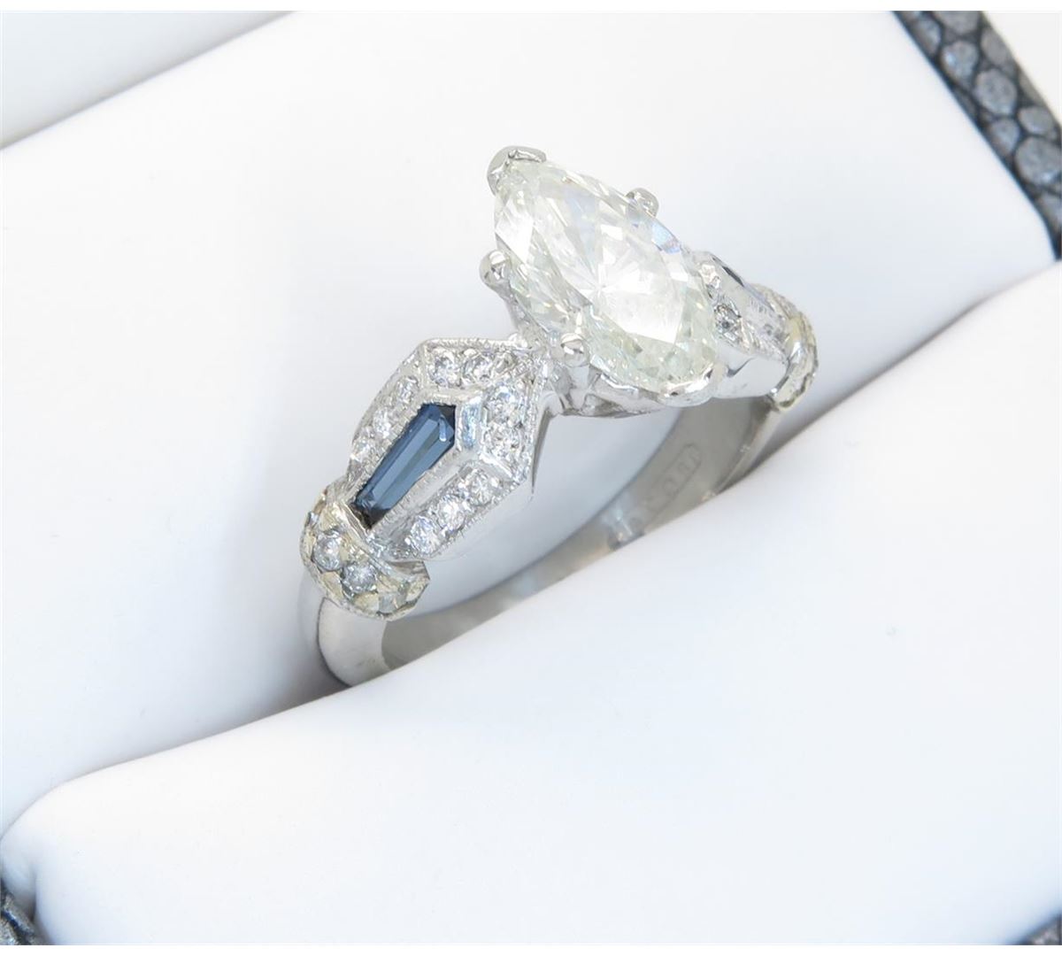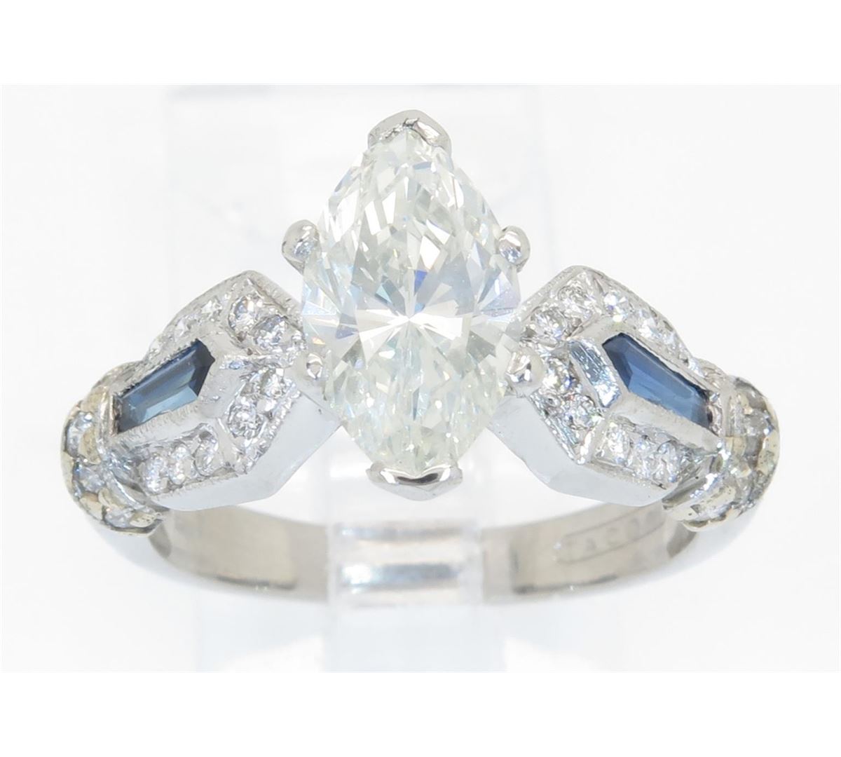 One tested platinum designer Tacori diamond ring. Containing: One EGL Certified Marquise Cut Diamond. Size: 1.74CT, Clarity: SI1, Color: J. 30 Round Brilliant Cut Diamonds, 2 blue sapphires. Approximate total diamond weight: 2.08CTW. Diamonds are graded in the mounting, unless otherwise stated. Weight: 9.1 grams. Size: 6.5 EGL USA Appraised.