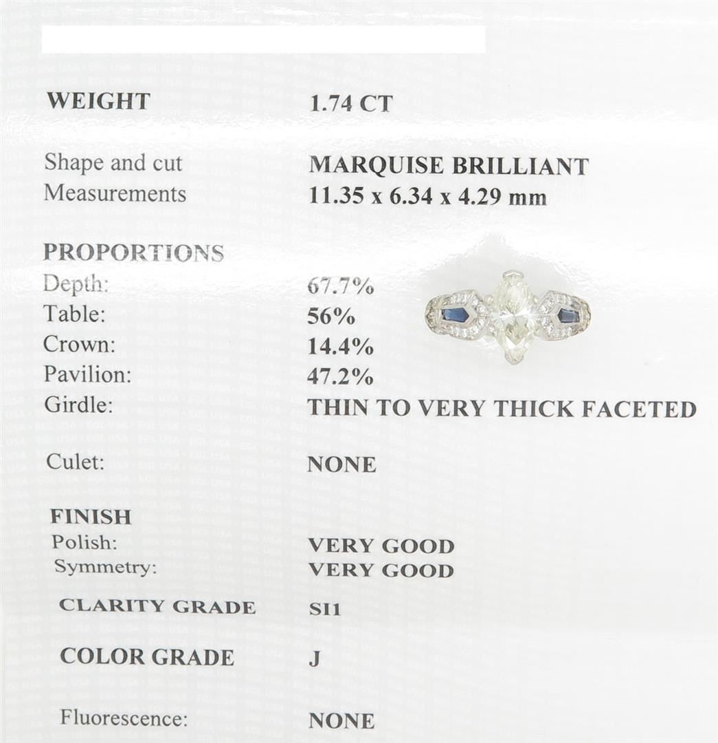 One tested platinum designer Tacori diamond ring. Containing: One EGL Certified Marquise Cut Diamond. Size: 1.74CT, Clarity: SI1, Color: J. 30 Round Brilliant Cut Diamonds, 2 blue sapphires. Approximate total diamond weight: 2.08CTW. Diamonds are graded in the mounting, unless otherwise stated. Weight: 9.1 grams. Size: 6.5 EGL USA Appraised.