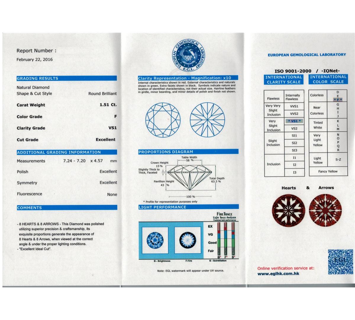 One pair electronically tested 14KT white gold lady's cast stud earrings with screw backs with a bright polish finish. Identified with markings of "14K". Condition is new, good workmanship. Containing: One prong set round brilliant cut diamond, measuring 7.37 - 7.32 x 4.51mm (depth est.) approximate weight of 1.50ct. Graded loose prior to setting in the EGL Laboratory, Report #EGL1502786938. Clarity: VS-1. Color: Excellent One prong set round brilliant cut diamond, measuring 7.24 - 7.20 x 4.57mm (depth est.) , 4.00.%. GTCF approximate weight of 1.51ct. Graded loose prior to setting in the EGL Laboratory Report #EGL1502786635. Clarity: VS-1. Color: Excellent. Total Weight of Diamonds 3.01ct. Total Weight of Earrings 2.30gm. GAS Appraised at $64,900.00.