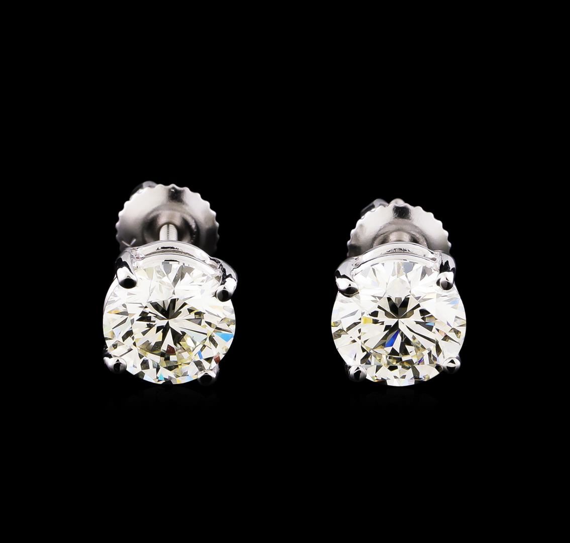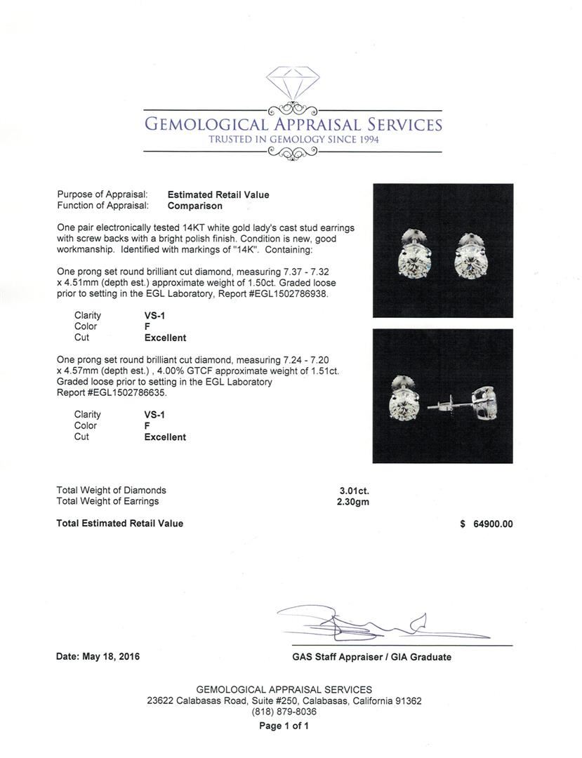 One pair electronically tested 14KT white gold lady's cast stud earrings with screw backs with a bright polish finish. Identified with markings of "14K". Condition is new, good workmanship. Containing: One prong set round brilliant cut diamond, measuring 7.37 - 7.32 x 4.51mm (depth est.) approximate weight of 1.50ct. Graded loose prior to setting in the EGL Laboratory, Report #EGL1502786938. Clarity: VS-1. Color: Excellent One prong set round brilliant cut diamond, measuring 7.24 - 7.20 x 4.57mm (depth est.) , 4.00.%. GTCF approximate weight of 1.51ct. Graded loose prior to setting in the EGL Laboratory Report #EGL1502786635. Clarity: VS-1. Color: Excellent. Total Weight of Diamonds 3.01ct. Total Weight of Earrings 2.30gm. GAS Appraised at $64,900.00.