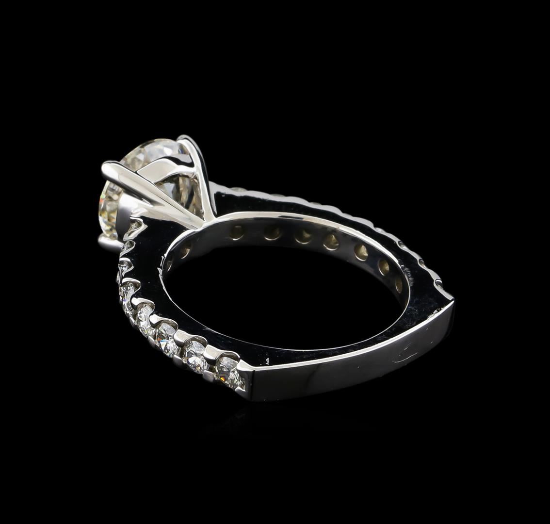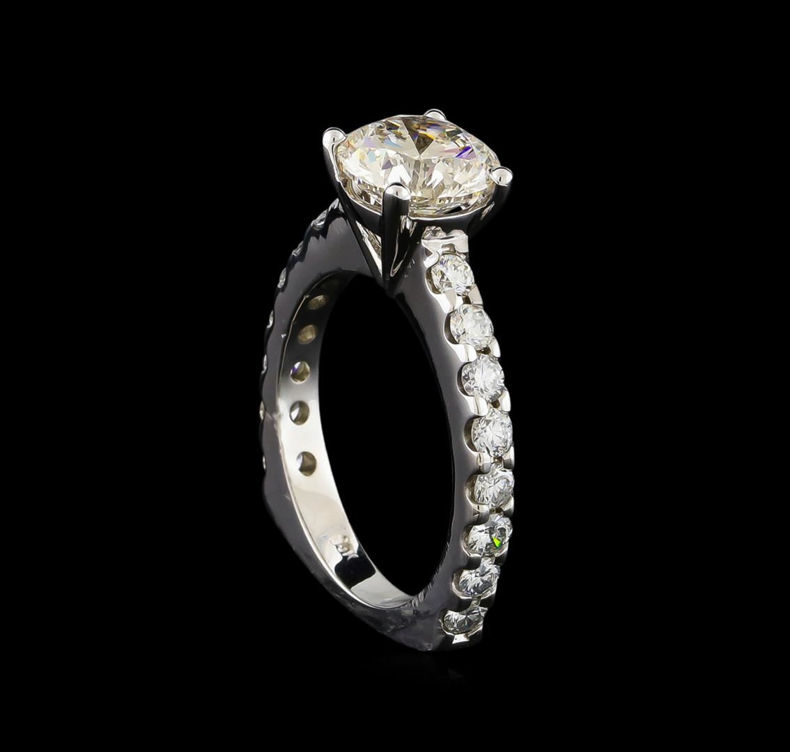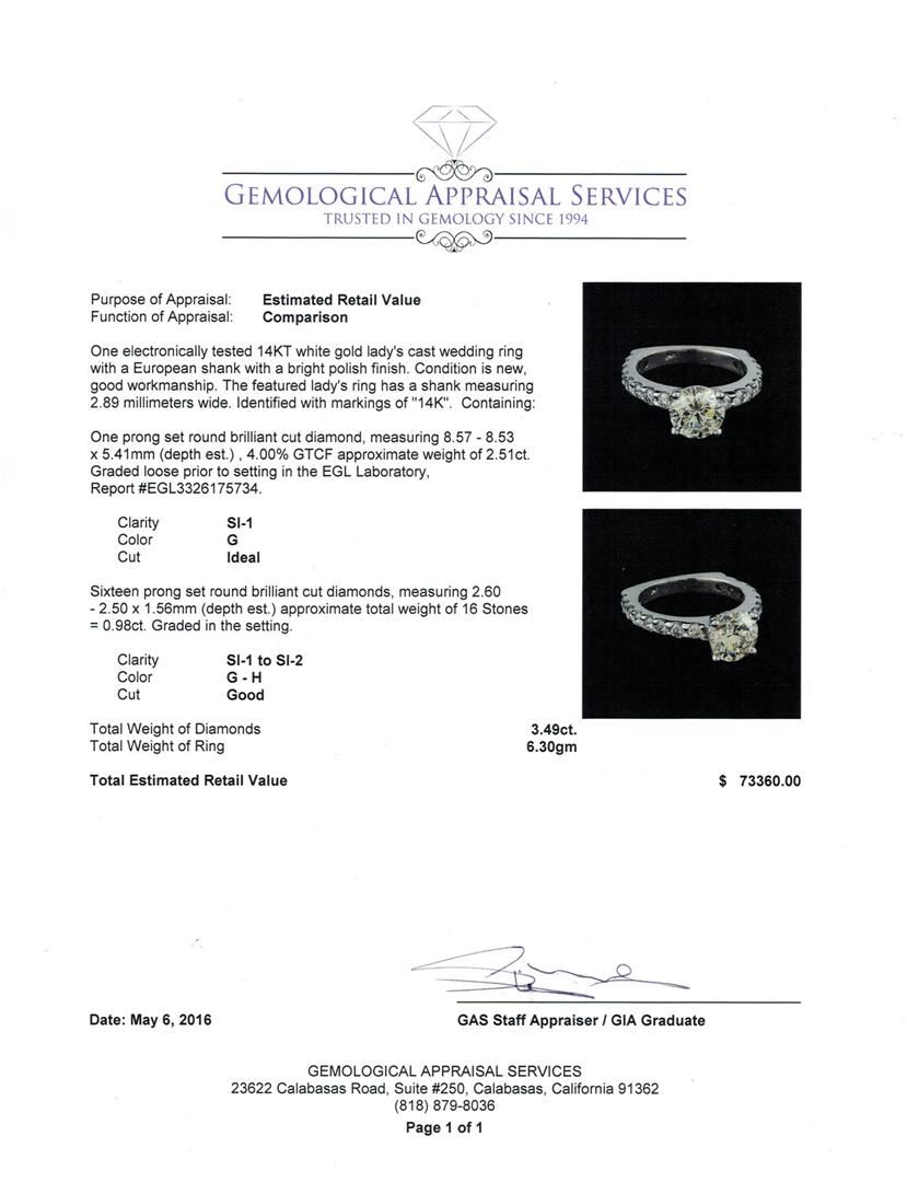 One electronically tested 14KT white gold lady's cast wedding ring with a European shank with a bright polish finish. The featured lady's ring has a shank measuring 2.89 millimeters wide. Identified with markings of "14K". Condition is new, good workmanship. Containing: One prong set round brilliant cut diamond, measuring 8.57 - 8.53 x 5.41mm (depth est.) , 4.00.%. GTCF approximate weight of 2.51ct. Graded loose prior to setting in the EGL Laboratory, Report #EGL3326175734. Clarity: SI-1. Color: Ideal Sixteen prong set round brilliant cut diamonds, measuring 2.60 - 2.50 x 1.56mm (depth est.) approximate total weight of 16 Stones = 0.98ct. Graded in the setting. Clarity: SI-1 to SI-2. Color: G - Good. Total Weight of Diamonds 3.49ct. Total Weight of Ring 6.30gm GAS Appraised at $73,360.00.
