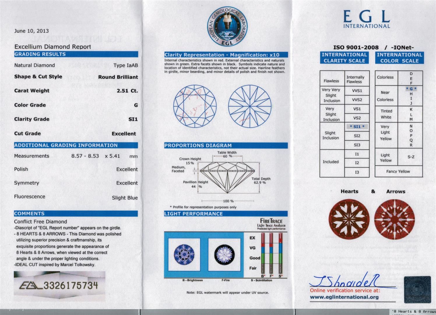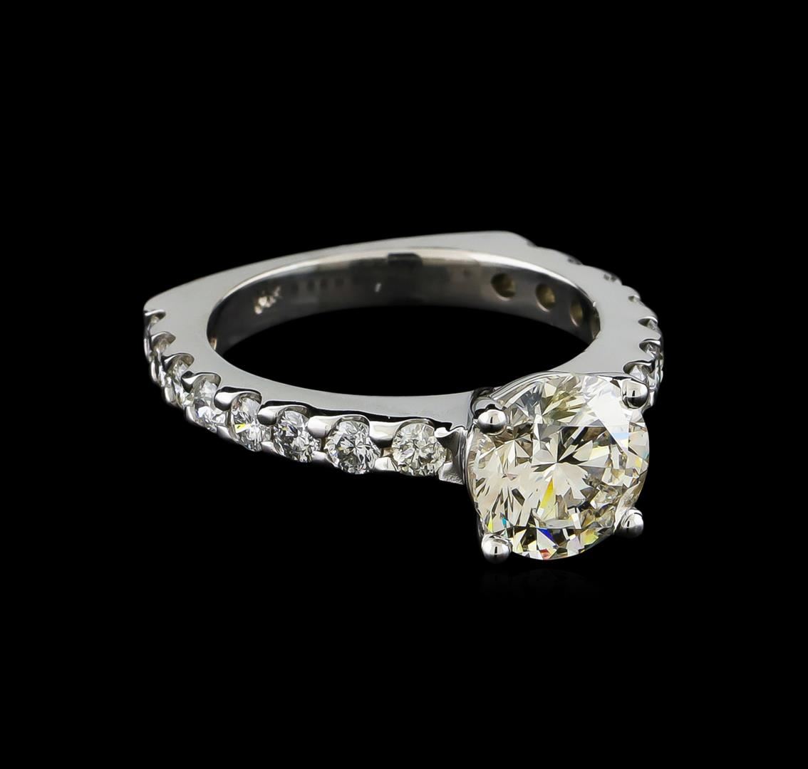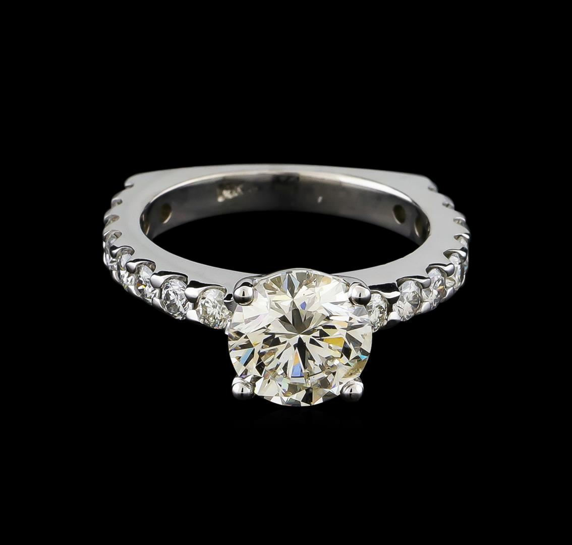 One electronically tested 14KT white gold lady's cast wedding ring with a European shank with a bright polish finish. The featured lady's ring has a shank measuring 2.89 millimeters wide. Identified with markings of "14K". Condition is new, good workmanship. Containing: One prong set round brilliant cut diamond, measuring 8.57 - 8.53 x 5.41mm (depth est.) , 4.00.%. GTCF approximate weight of 2.51ct. Graded loose prior to setting in the EGL Laboratory, Report #EGL3326175734. Clarity: SI-1. Color: Ideal Sixteen prong set round brilliant cut diamonds, measuring 2.60 - 2.50 x 1.56mm (depth est.) approximate total weight of 16 Stones = 0.98ct. Graded in the setting. Clarity: SI-1 to SI-2. Color: G - Good. Total Weight of Diamonds 3.49ct. Total Weight of Ring 6.30gm GAS Appraised at $73,360.00.